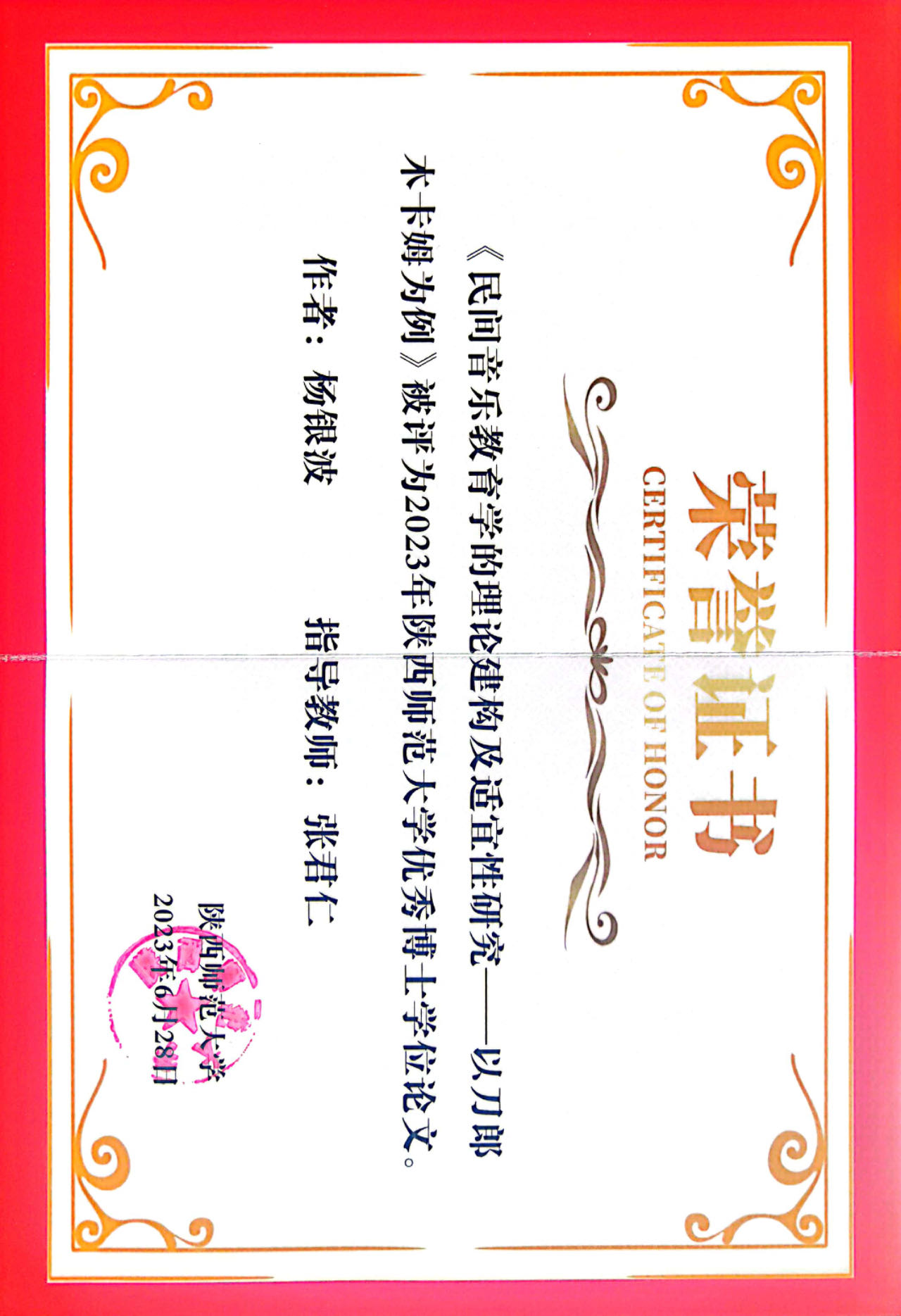 杨银波是全讯白菜官网2019级课程与教学论专业(丝绸之路各民族传统音乐传承与教育研究方向)博士研究生,导师是张君仁教授。该生在校四年勤奋踏实,成绩优秀。四年间在专业学术刊物发表学术论文九篇,其中CSSCI期刊6篇(含权威期刊3篇),参与国家社科基金3项,省部级课题6项,主持博士研究生自由探索项目1项,获得国家奖学金一次,积学一等奖学金四次,获得省级以上科研奖3项,获得陕西省优秀毕业生荣誉称号。