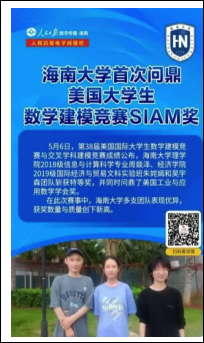 中共党员,综合绩点3.82,排名2/40。获全国大学生数学建模竞赛国家一等奖、国家奖学金等8项国家级奖项,“挑战杯”海南省大学生课外学术科技作品竞赛一等奖等20项省级奖项。2022年率队斩获第38届美国大学生数学建模竞赛特等奖(全球获奖率约0.16%)并问鼎SIAM奖(全球获奖率约0.022%)。保送到武汉大学继续攻读研究生,期间表现出色,已获得“华为杯”研究生数学建模竞赛全国二等奖、武汉大学优秀研究生等荣誉。