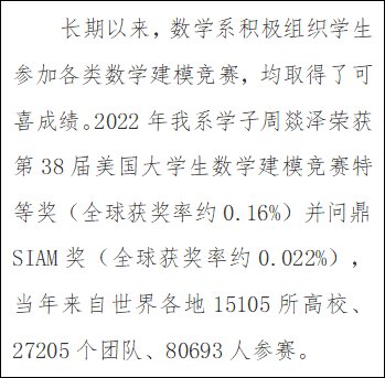 实践实训:着重培养学生专业基础能力和创新能力,积极鼓励学生积极参与丰富多彩的校园文化活动,丰富学生第二课堂,提升学生综合素质。组织学生参加“全国大学生数学建模竞赛”、“全国大学生数学竞赛”、“美国大学生数学建模竞赛”、“互联网+大学生创新创业大赛”等各级各类学科竞赛,近五年,培养学生共获国家一等奖6项、国家二等奖30余项,省级一等奖150余项。在2022年第38届美国国际大学生数学建模竞赛(MCM)与交叉学科建模竞赛(ICM)中, 2018级学子周燚泽团队斩获特等奖(Outstanding Winner),并同时问鼎了美国工业与应用数学学会奖(SIAM Award,简称SIAM奖)。学生发表SCI论文和申请专利等30余项,毕业生就业率均保持在90%以上。