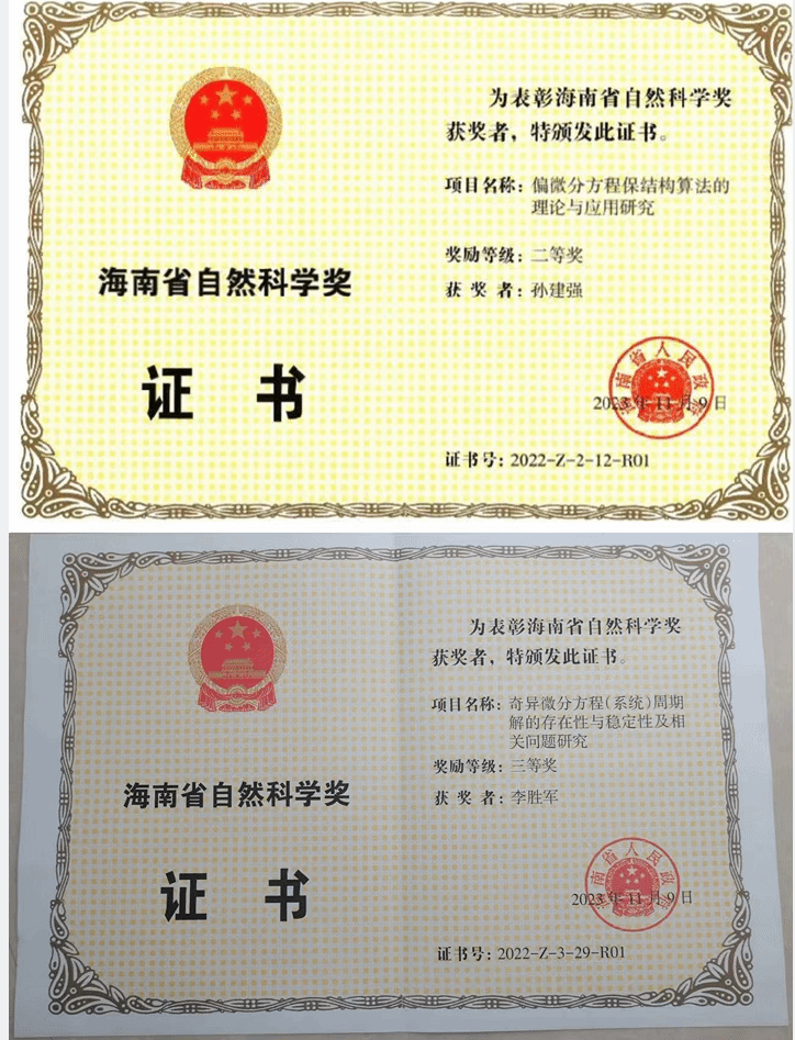 12月5日,海南省科学技术奖励大会在海口召开,省委书记、省人大常委会主任冯飞出席会议并讲话,省委副书记、省长刘小明主持,省委副书记沈丹阳等省领导出席会议。jinnianhui今年会有20项科研成果获得了2022年度海南省科学技术奖。今年会官网2项科研成果获得了2022年度海南省自然科学奖,取得了优异的成绩。今年会官网孙建强教授主持申报的“偏微分方程保结构算法的理论与应用研究”获得了海南省自然科学奖二等奖,李胜军教授主持申报的“奇异微分方程(系统)周期解的存在性与稳定性及相关问题研究”获得了海南省自然科学奖三等奖。表明今年会官网数学学科微分方程理论与数值方法的研究取得了重大进展。